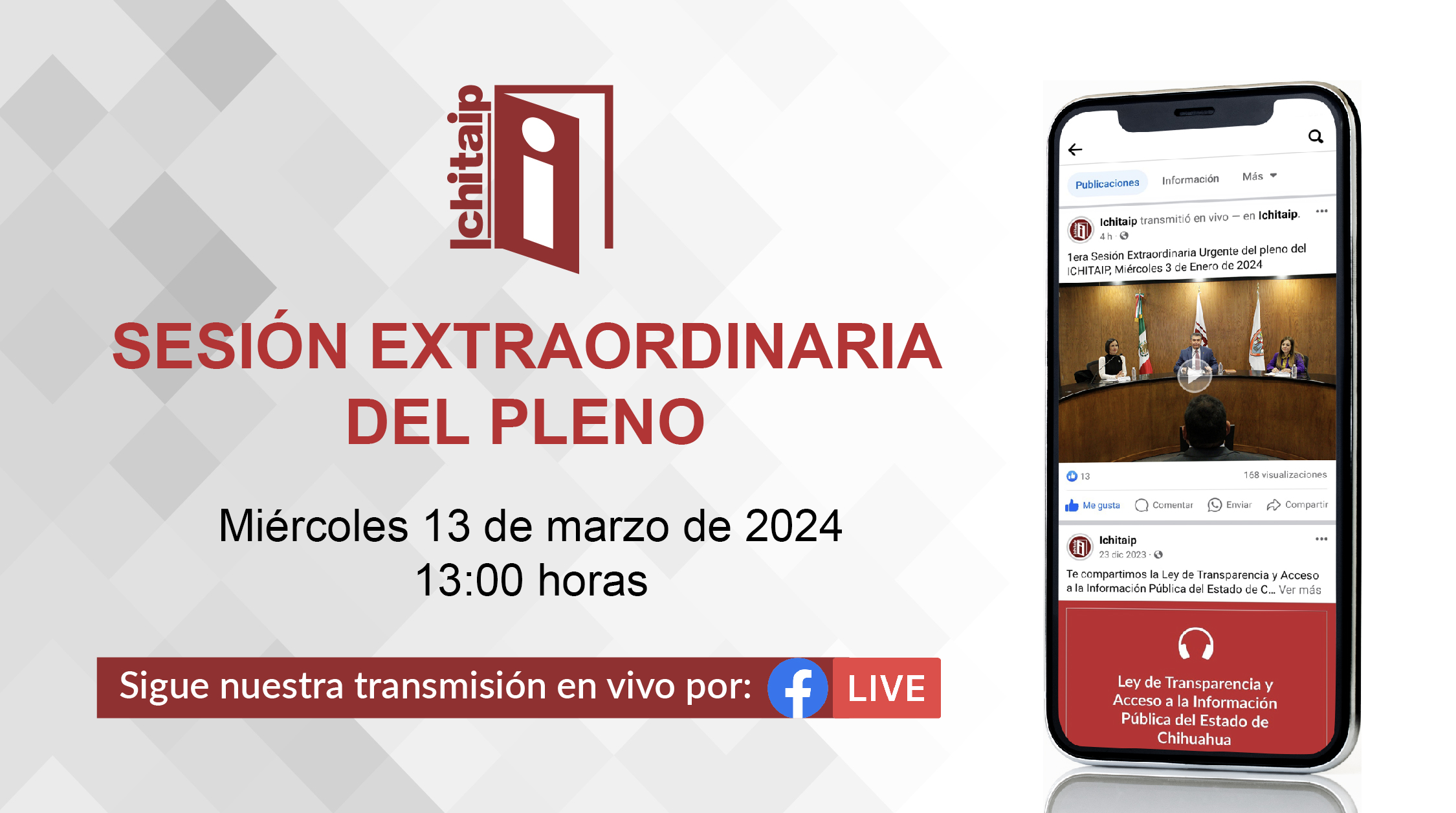 Se convoca a la octava sesión extraordinaria, del Pleno del Instituto Chihuahuense para la Transparencia y Acceso a la Información Pública, a celebrarse a las 13:00 horas, del día 13 de marzo del año 2024, en la sala de Plenos, en el domicilio Av. Teófilo Borunda No. 2009, Colonia Arquitos en Chihuahua, Chihuahua, con fundamento en el artículo 24 fracción III de la Ley de Transparencia y Acceso a la Información Pública del Estado de Chihuahua; artículos 12 fracción II, 13 fracción I del Reglamento Interior; y artículos 5 inciso a), 10 inciso b), 11 y 12 segundo párrafo, 13 y 15 del Reglamento de Sesiones, bajo el siguiente: