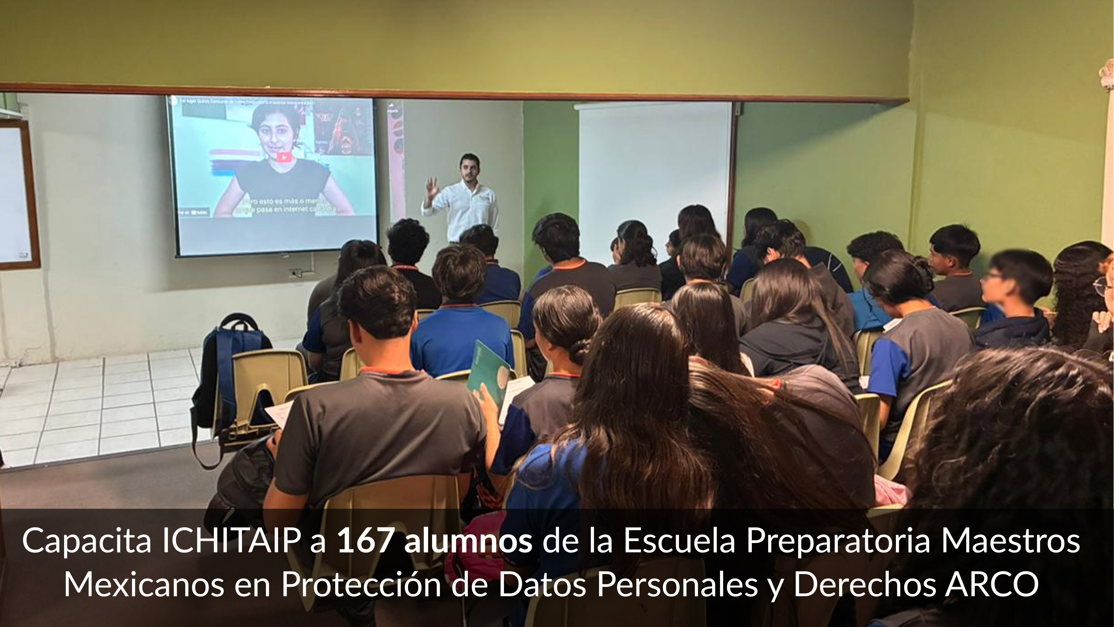Divididos en dos grupos, el Instituto Chihuahuense para la Transparencia y Acceso a la Información (ICHITAIP) brindó una charla de capacitación a 167 alumnos de la Escuela Preparatoria Maestros Mexicanos sobre “Protección de Datos Personales y Derechos ARCO”.