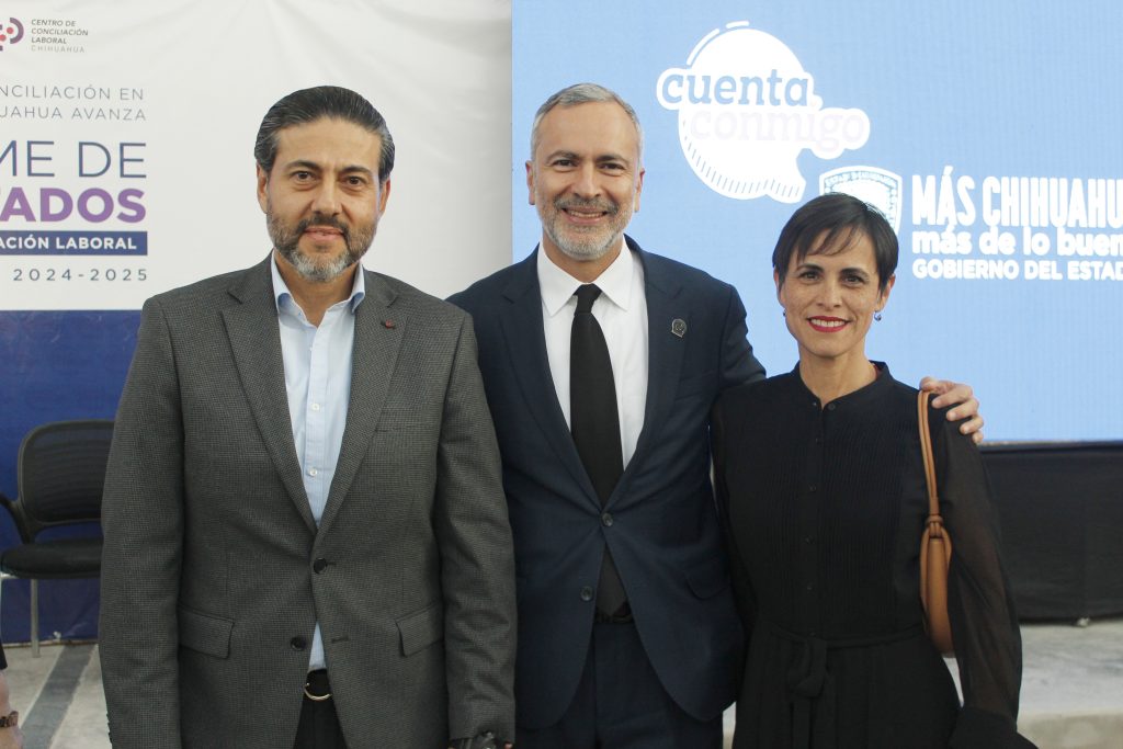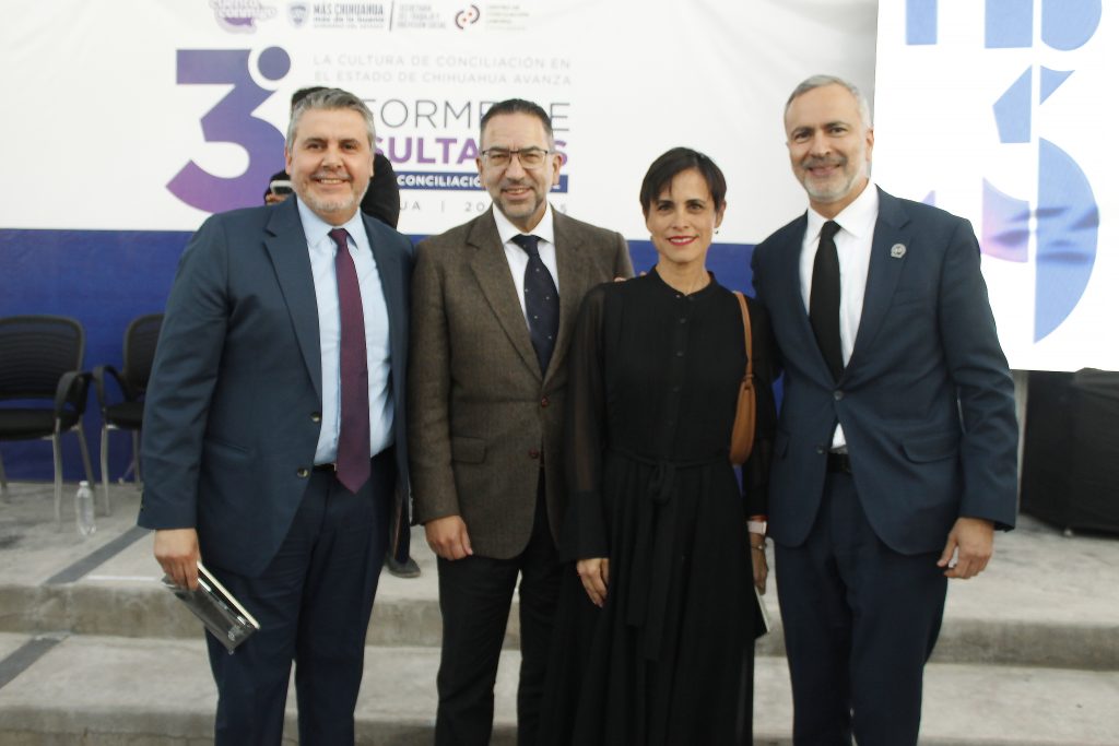 La Comisionada del Instituto Chihuahuense para la Transparencia y Acceso a la Información Pública (ICHITAIP) Karla Gabriela Fuentes Moreno y el Comisionado Presidente, Sergio Rafael Facio Guzmán, felicitaron a Fausto Fortunato Barraza Arvizu, Director General del Centro de Conciliación Laboral del Estado de Chihuahua por la presentación de su Tercer Informe de Resultados.