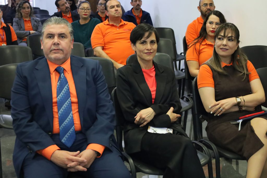 Los servidores públicos del Órgano Garante de Chihuahua, con playera naranja y encabezados por las Comisionadas Karla Gabriela Fuentes Moreno y María Selene Prieto Domínguez, así como por el Comisionado Presidente, Sergio Rafael Facio Guzmán, escucharon la exposición de Alejandro Razo Mendoza, capacitador de la Comisión Estatal de los Derechos Humanos.